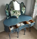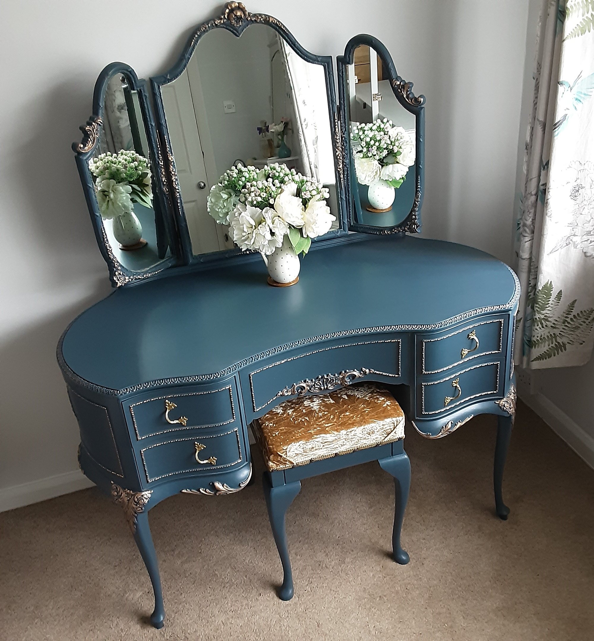 This vintage Louis style dressing table has a triple mirror that is