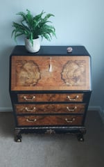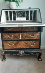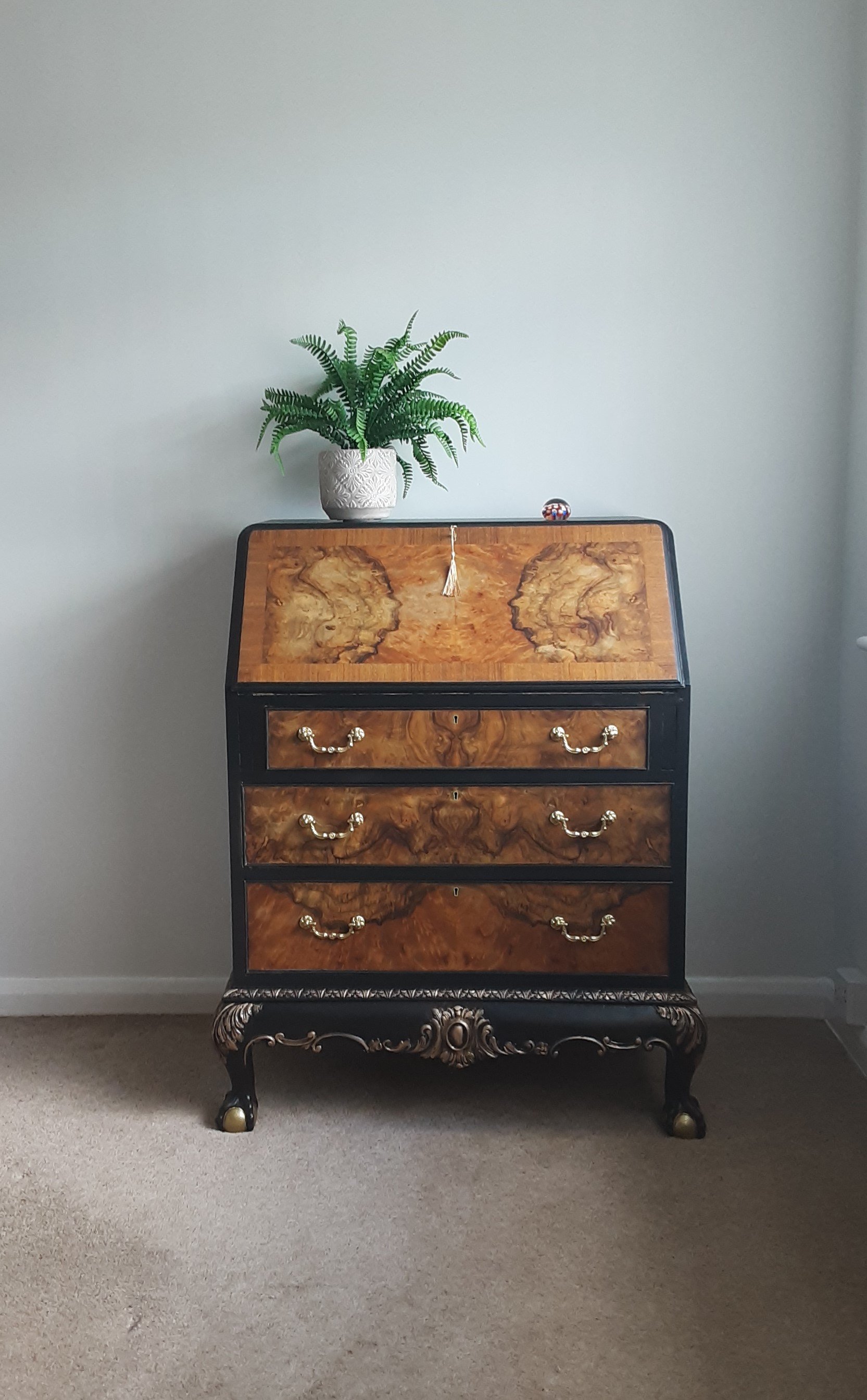 Finished in a black eggshell paint with three drawers and drop down lid stripped back to reveal the original gorgeous burr walnut grain then treated with a wax varnish.
